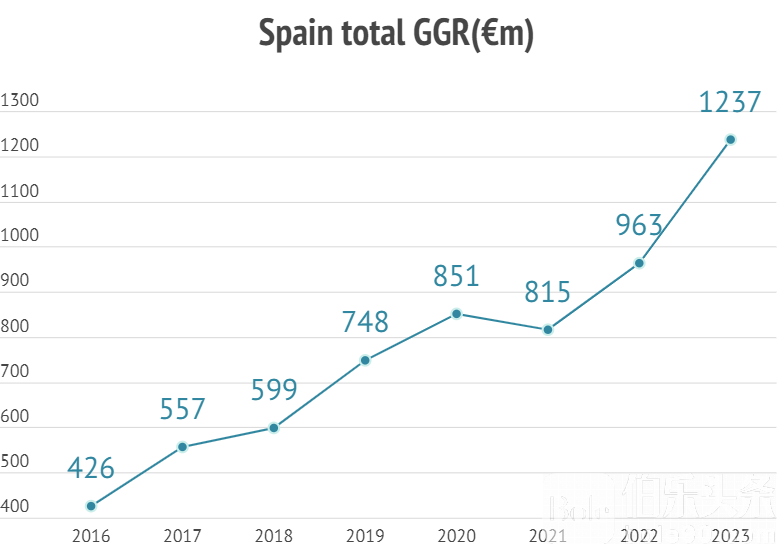 在2023年西班牙博彩监管总局 (DGOJ) 公布的最新数字显示,2023 年博彩总收入 (GGR) 为 12.4 亿欧元(10.6 亿英镑/13.5 亿美元),同比增长超过四分之一,达到 28.4%。看看以下这张图表就能很清楚的知道西班牙博彩从2016年到2023年的当局的博彩收入情况。