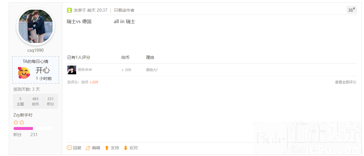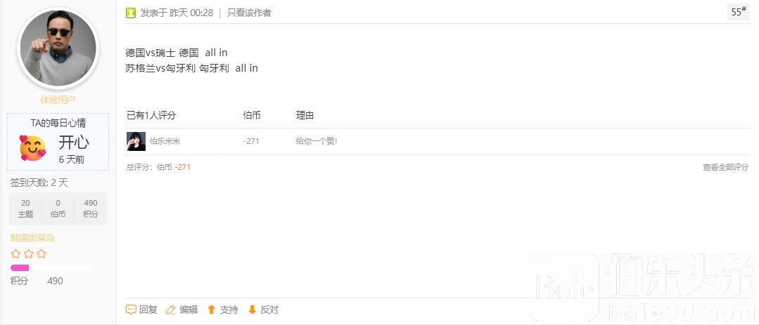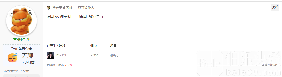 同时,我们每日的竞猜活动新增了一个保底规则:如果伯友通过竞猜账户伯币清零或低于50,可在每日的活动贴下方留言申请补贴哦!(50伯币)