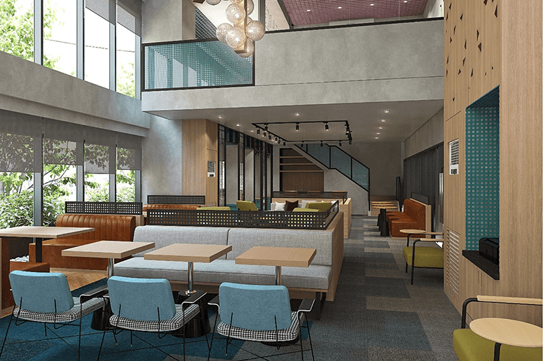 在内部,居民将受到以现代和工业当代设计为特色的高天花板大堂的欢迎。