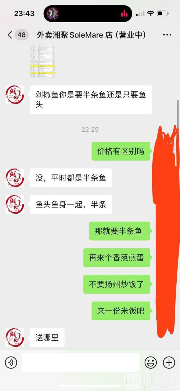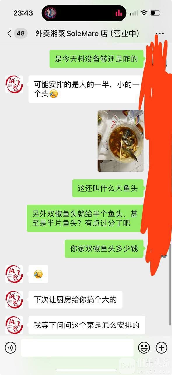 我拍照片过去,鱼头还没有三分之二根筷子长,还敢说大鱼头,拍照过去,商家又说下次给我整个大的。我看到我这话我都笑了,好像看我大侄跟我说,中500w给我买大房子似的,又说等下问问厨房怎么安排的,你继续在那等下吧,等下曝光群见吧。
