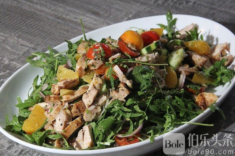 6. 将所有沙拉配料放入碗中混合。挤入橙汁、柠檬汁和橄榄油。