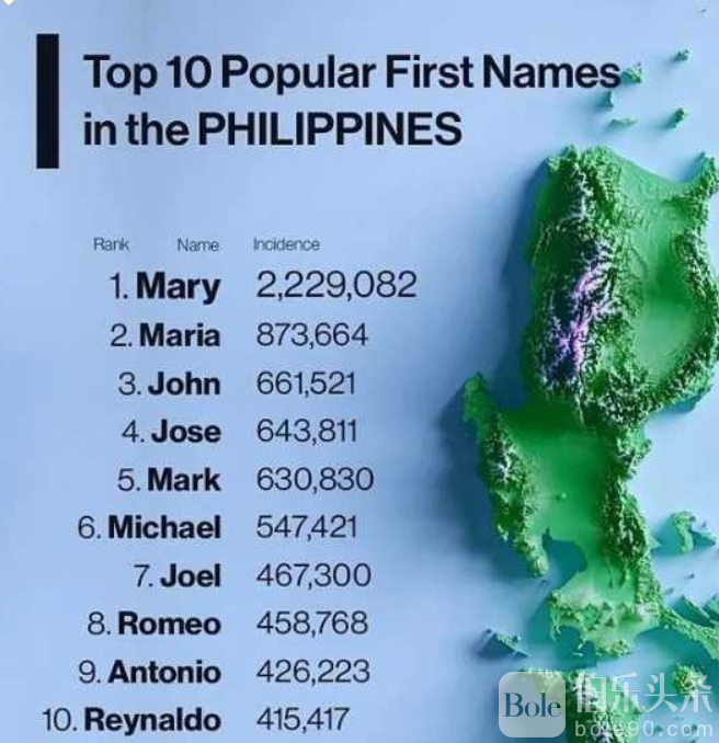它还列出了该国1,000 个最受欢迎的名字,其中位列前十的菲律宾英文名榜单如下。