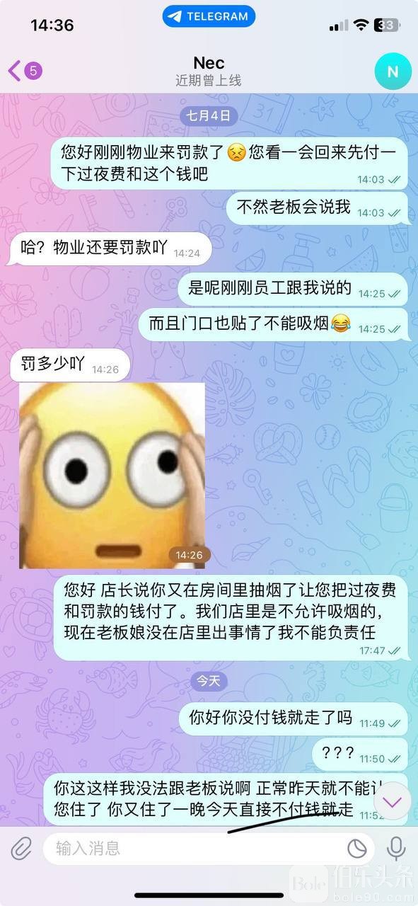 我们收到物业的警告和罚款,让他付他也不付,昨天发现他抽烟已经赶他走了不想再给他留宿过夜,已经赖在店里2天了,我们有按摩有美容有汗蒸桑拿,我说你随便消费点啥项目我都好和老板交差啊,他不消费也死赖着不走,罚款也不付说没有现金,支付宝微信告诉我说被封了,说今天中午他女友来接他会付款。