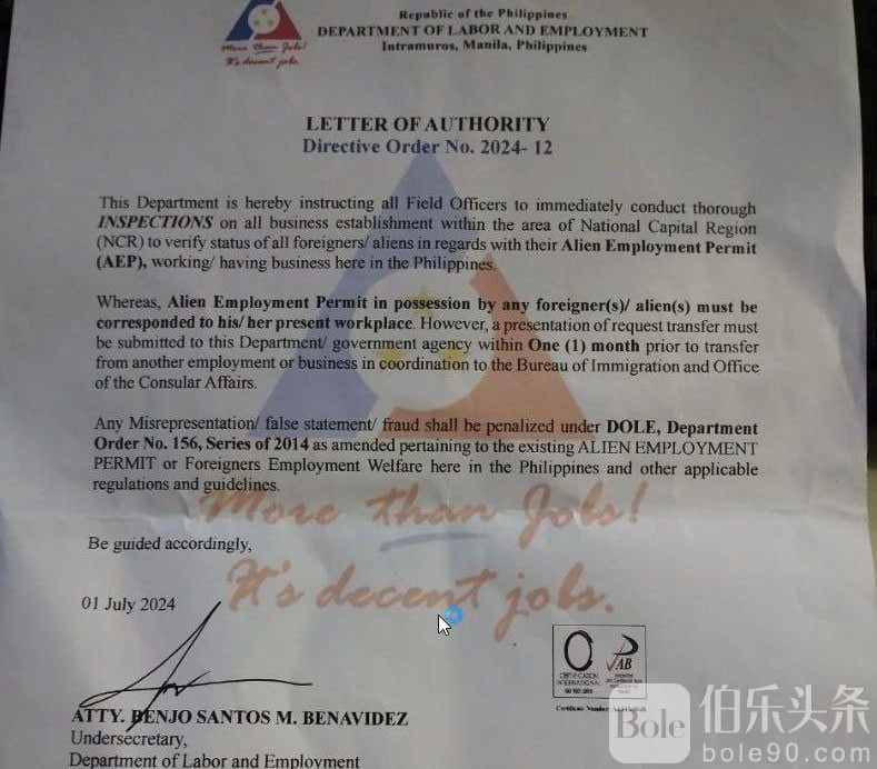 劳工部检查所有在马尼拉的外国商家,而且还有文件,目前已经发到我店里