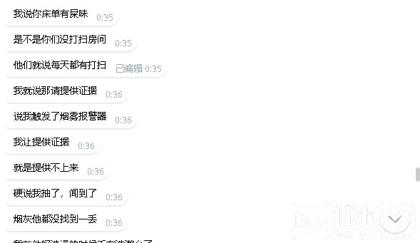 我就觉得很搞笑 店大欺客是吗?还是说你们家干不下去缺钱啊?非说我抽烟触发了烟雾报警器 我让他提供证据 就是提供不出来 非要说我抽烟了