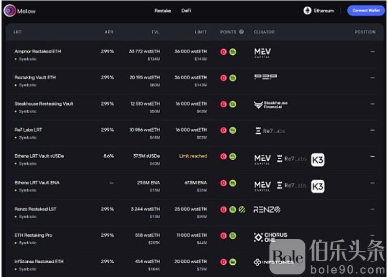 可以肯定的是,Bob可以尝试选择一个“更安全”的节点运营商,但有数百个运营商在相互竞争,他们希望获得你的再质押抵押品,并且都受到激励去尽可能多地验证AVS,让你的收益最大化。 稍微看一下EigenLayer上的节点运营商页面,我们就可以从中看到许多下面这样的非常明显的广告。 这种竞争状态可能会形成无人乐见的糟糕结果:每个节点运营商都验证了他们认为绝对可靠的AVS。当AVS运行中断并发生罚没事件时,无论Bob选择哪个运营商,他都会受到影响。 3、了解Mellow FinanceMellow(在某种程度上)解决了这个问题。Mellow也被称为“模块化LRT”,是再质押技术栈的中间件 (middleware)层,提供可定制的流动性再质押金库。有了Mellow,任何人都可以成为自己的Ether.Fi或Renzo,建立他们自己的LRT金库。这些Mellow上的第三方“管理者”将完全控制要接受哪些再质押资产,然后用户将根据自己的风险偏好选择资产,并为此支付一定的费用。 这里举一个荒谬的例子:Alice是DOGE铁粉,她正在投资DOGE寻求收益。她在Mellow上看到了一个名为DOGE4LYFE的金库。她将她的DOGE存入这个DOGE4LYFE金库,获得再质押收益,她向运营商支付一小笔费用,获得名为rstDOGE的LRT,然后她可以在他处将其用作DeFi抵押品。这在目前是不可能的,因为DOGE 不在EigenLayer的白名单中。即使EigenLayer创始人Sreeram将目光转向DOGE,前面提到的节点运营商面临的激励不一致的问题仍然存在。 如果这一切听起来很熟悉,那是因为在DeFi借贷领域已经出现了类似的服务,如Morpho、Gearbox,或者(上一个周期的DeFi老友可能还记得)由Rari开发的现已弃用的Fuse协议。以Morpho为例,它允许创建带有自定义风险参数的借贷金库。这就允许用户从具有独特风险配置的金库中借入资产,而不是Aave上的具有一刀切风险的借贷池。在即将到来的V4升级中,Aave还计划使用单独借贷池来升级协议。 4、Mellow x Symbiotic x Lido战略由于Mellow只是一个中间件再质押协议,因此它在金库中的资产必须在某处再质押。有趣的是,Mellow并未与EigenLayer在战略上保持一致,而是选择了即将推出的再质押协议Symbioti,Symbioti得到了Lido旗下风投公司cyber•Fund以及Paradigm的支持(Paradigm也支持了Lido)。