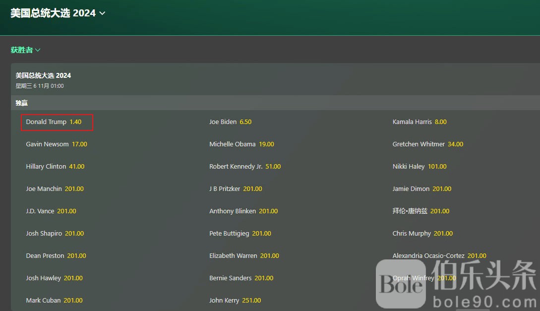 美国大选赌盘数据: