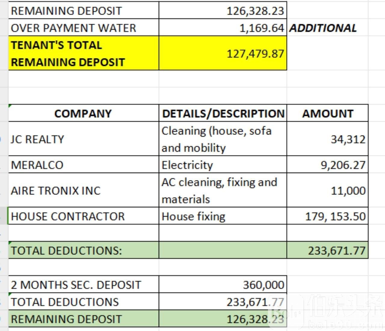 我想着这些都是小东西,无所谓,最多扣我10万p,两个多月账单出来了。扣了我24万多,我就呵呵,说几个很离谱的。账单空调重复收费一万多,询问中介直接不回复,房间得灯都是好的换灯扣了我一万多。