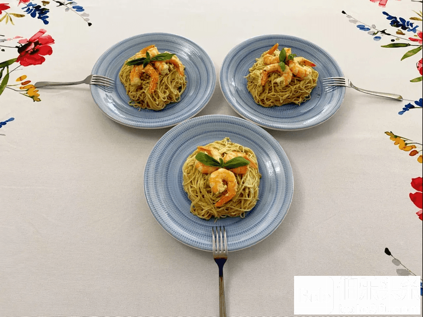 步骤2做法:烧一锅水煮开后放入适量盐下意面煮熟捞出备用。锅加入适量油放入适量虾仁两面煎至金黄色、加入适量料酒、胡椒碎、盐和鸡粉调味,倒入适量淡奶油和牛奶搅拌均匀后下煮熟的意面拌匀后关火。加入适量青酱搅拌均匀即可出锅摆盘上桌