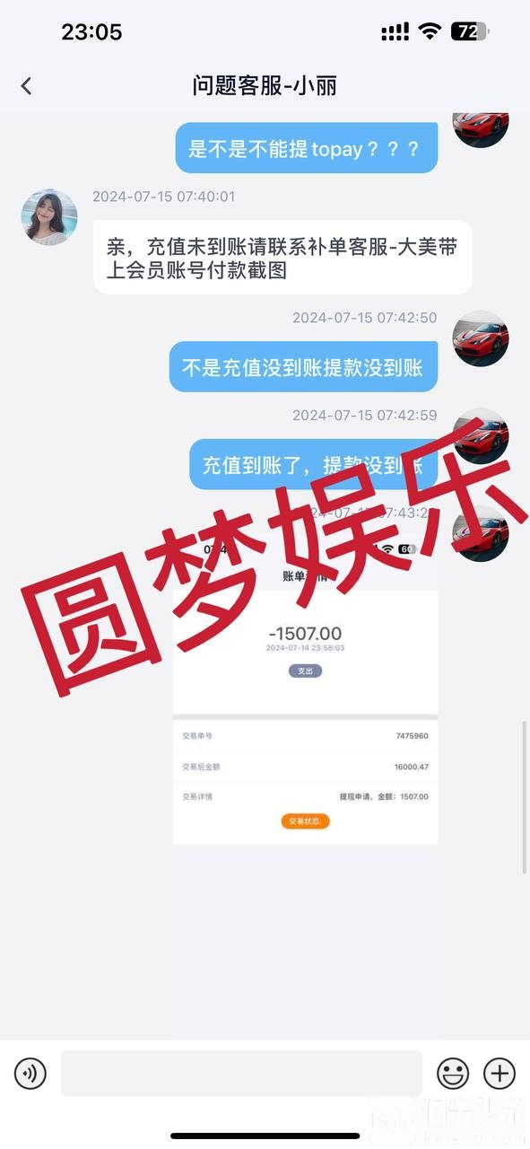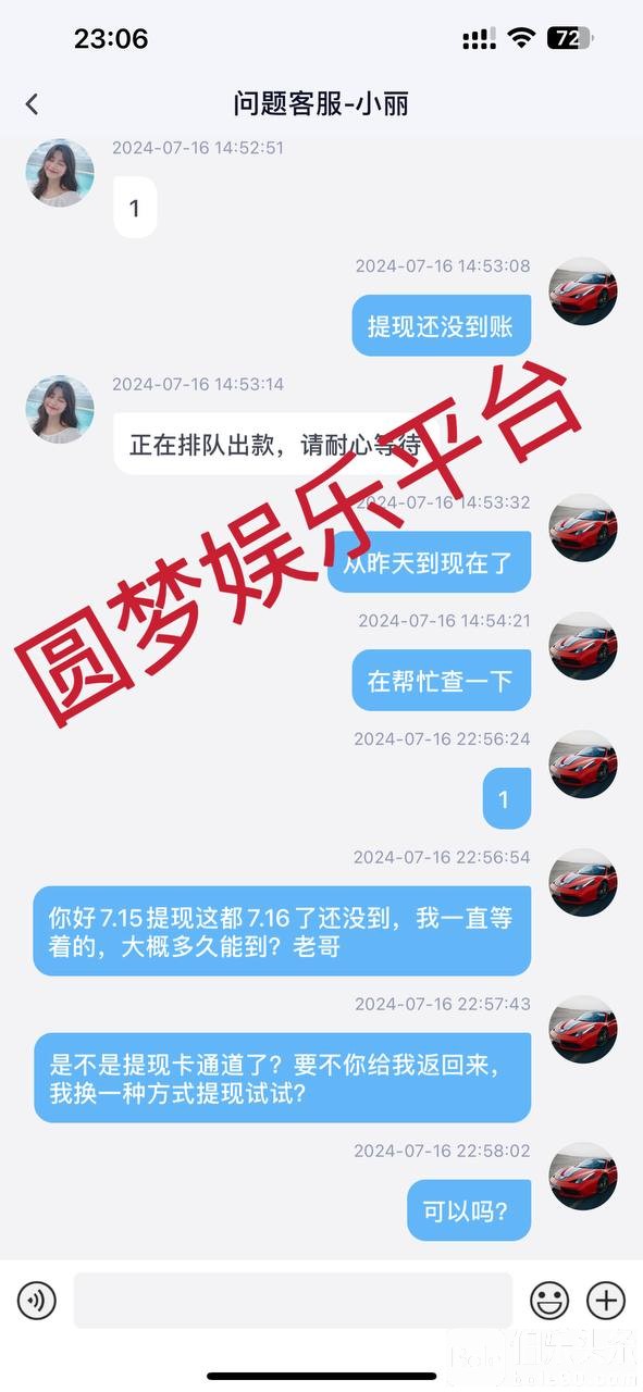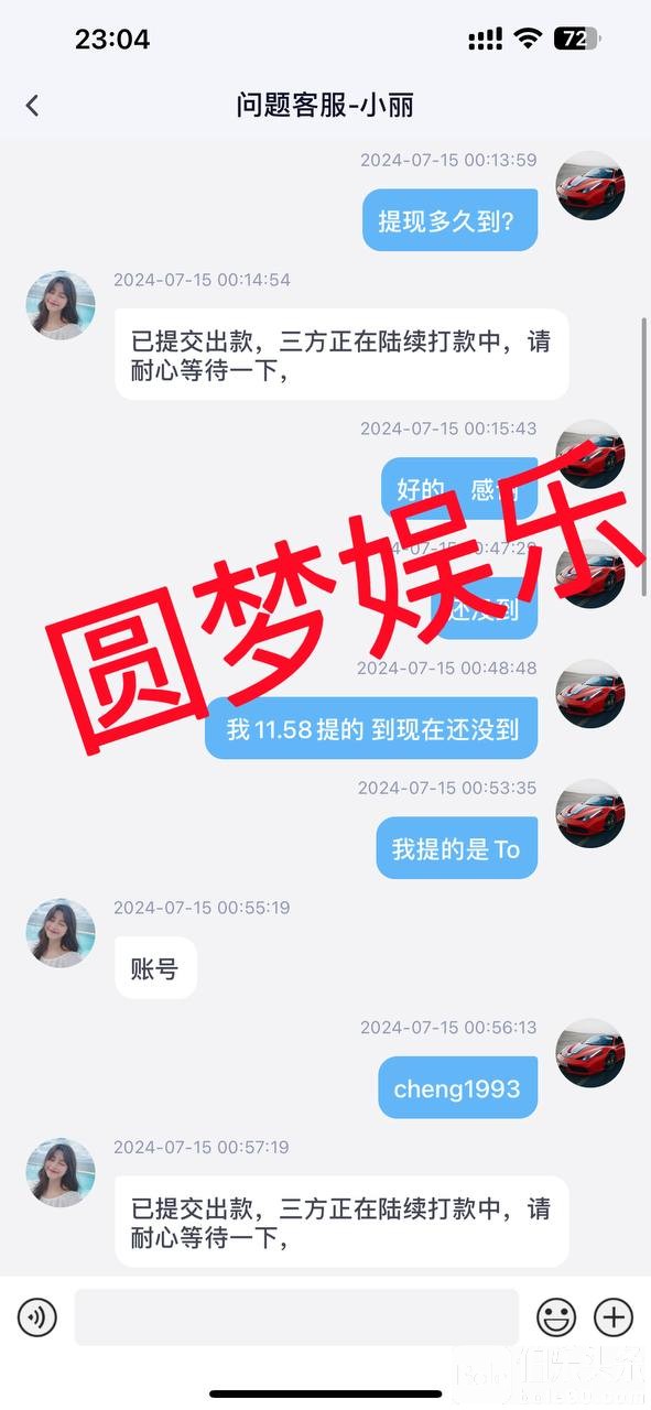 我是7.15号凌晨12.03提现1507然后余额还有16000 平台客服回应 已提交出款 三方正在陆续打款中,请耐心等待 ,到了第二天我又问了在线客服 ,在线客服又回复了请耐心等待,今天都7.16号了还没到账,最早一开始 我找飞机圆梦合营部问我的上级是谁,回复我账号没有上级。然后平台客服回应今天又说我有上级,让我找我的上级处理,我一个玩家走的官方的链接,我怎么知道我有没有上级?问客服要我上级的联系方式也不给,我现在找不到帮助,现在很无助 平台客服不回复 我也没有上级。我只玩PG电子任何违规都没有,哪里出问题了?不给出款是不是我充的太少了打上去了,你们要准备黑掉这个款?