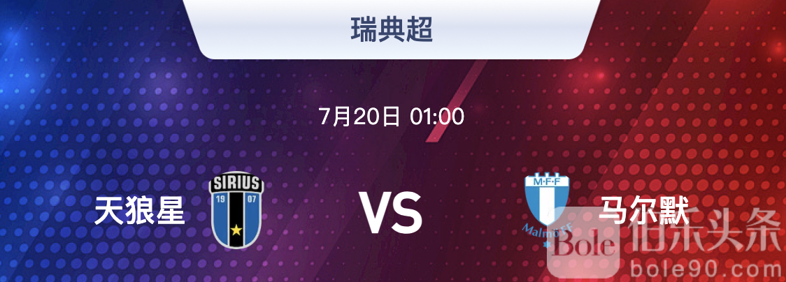 今天推荐的比赛是 07月20日 01:00 开赛的 瑞典超 天狼星 VS 马尔默
