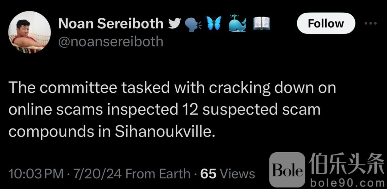 就在刚刚,柬埔寨网红记者诺安·瑟伟波(Noan Sereiboth)在X(推特)上发帖透露,打击电诈委员会对西港的12个疑似从事电诈活动的园区进行了扫荡。
