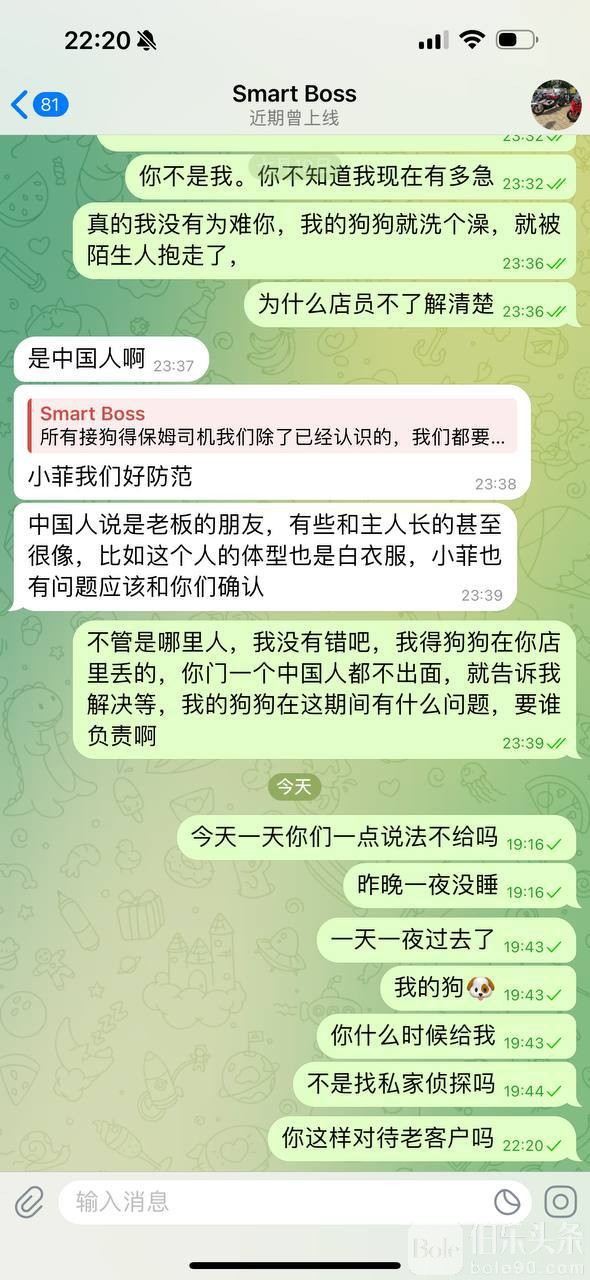 到家后我和我女朋友去店里取狗狗我们在给狗狗买吃的都挑好了准备结账狗狗还没有抱出来给我,我女朋友就有点着急,一天没见到崽,问店员店员说让我们稍等一下,等了快半个小时了,也没有抱出来,我女朋友急了去问怎么回事,结果告诉我们狗狗被人抱走了,,视频上的人我不认识,我女朋友找他老板,这个老板直接告诉我们在开车去机场回国有事情,然后就是让我们等,他的解决方式就是等