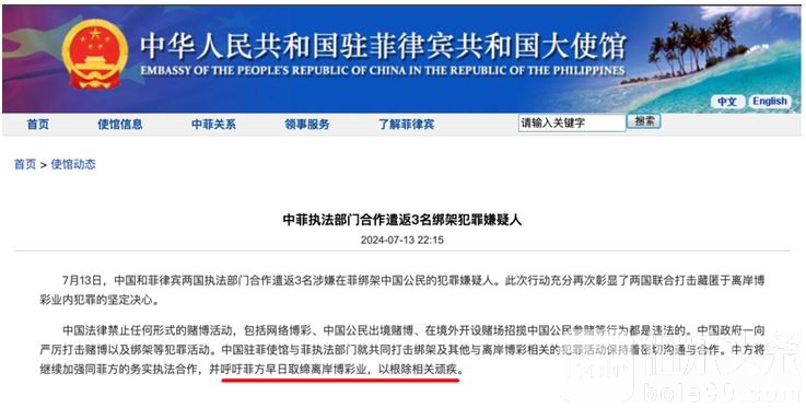 图:驻菲大使馆呼吁菲方早日取缔离岸博彩业。不知道中方和菲方的离岸博彩业指的是不是同一个?