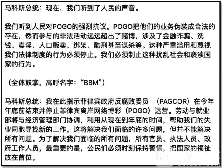 而今年的长达2小时的SONA报告,在快临近尾声,压轴时候,马科斯喊出:‘Effectivetoday,allPOGOsarebanned.‘,从今天起,所有 POGOs 均被禁止。
