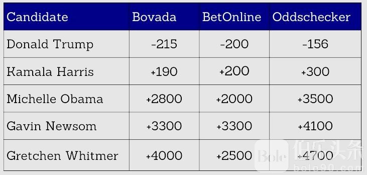 卡马拉·哈里斯在民主党总统候选人中的胜出赔率最高,为 +350。然而,唐纳德·特朗普仍然是领跑者,赔率为 -161,比拜登退出后的 -189 略有下降。