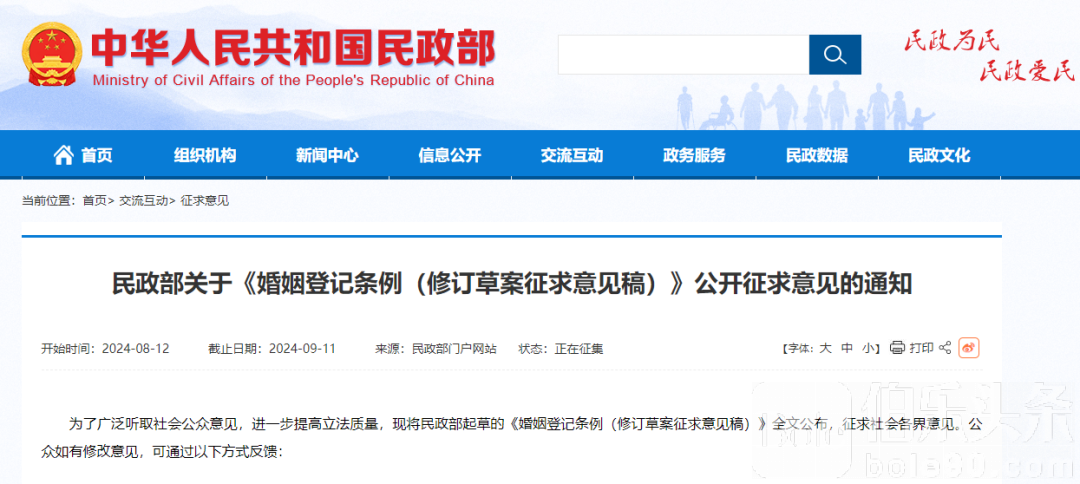 8月12日,《婚姻登记条例(修订草案征求意见稿)》(以下简称草案)在民政部网站全文公布并公开向社会征求意见。