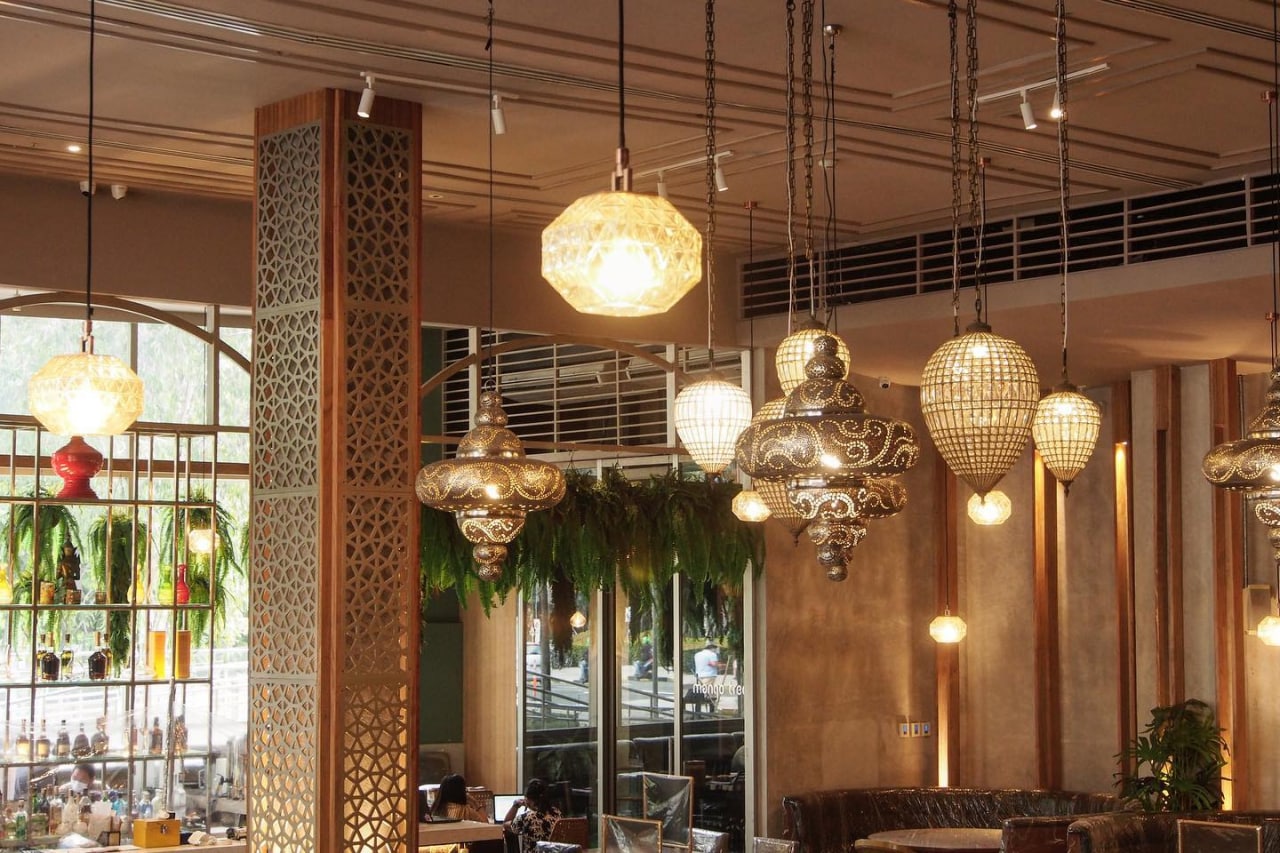 Mango Tree是位于Taguig的一家来自泰国的国际连锁餐厅,供应正宗的泰国菜和融合餐。临街的大落地窗,各色充满设计感的玻璃吊灯,高大的绿植与木质藤编桌椅的组合,让人一进店就恍惚置身曼谷的感觉。