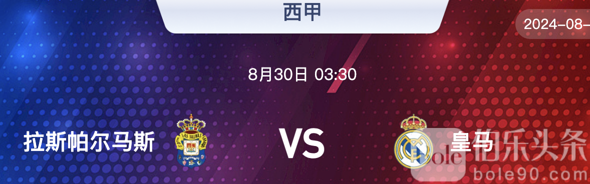 今天推荐的比赛是 8月30日 03:30 开赛的 西甲 拉斯帕尔马斯vs皇马