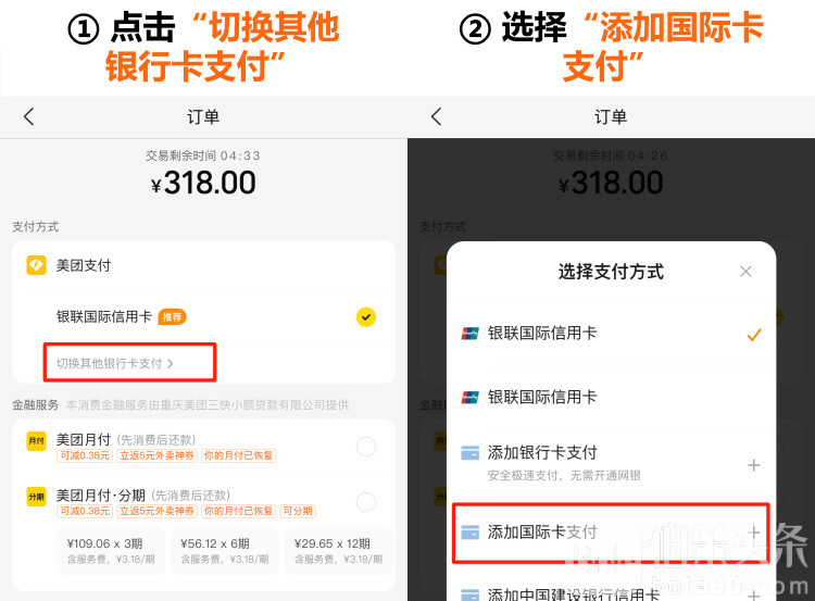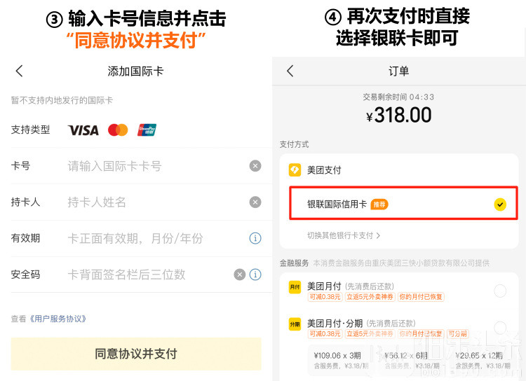用户在支付订单时,点击“切换其他银行卡支付”,选择“添加国际卡支付”,输入卡号信息并点击“同意协议并支付”;支付成功后银联卡会自动绑定美团钱包,再次支付时无需输入卡号信息,直接选择已绑定的银联卡即可。