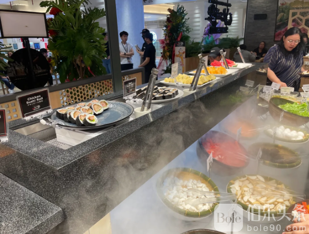 火锅食材经过喷雾处理以保持新鲜,包括泡菜、大白菜、日本韭菜、豆芽、姬菇、菠菜、白菜、玉米棒和胡萝卜等。
