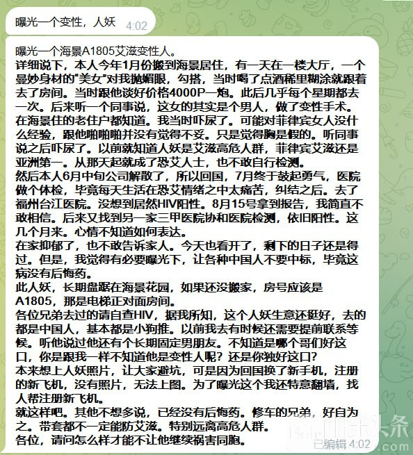 详细说下,本人今年1月份搬到海景居住,有一天在一楼大厅,一个曼妙身材的“美女”对我抛媚眼,勾搭,当时喝了点酒稀里糊涂就跟着去了房间。当时跟他谈好价格4000P一炮。此后几乎每个星期都去一次。后来听一个同事说,这女的其实是个男人,做了变性手术。在海景住的老住户都知道。我当时吓尿了。可能对菲律宾女人没什么经验,跟他啪啪啪并没有觉得不妥。只是觉得胸是假的。听同事说之后吓尿了。以前就知道人妖是艾滋高危人群,菲律宾艾滋还是亚洲第一。从那天起就成了恐艾人士,也不敢自行检测。