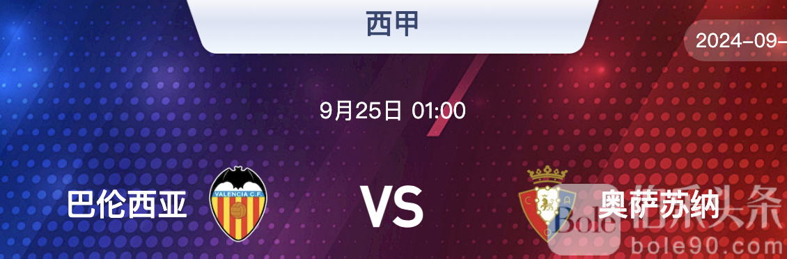 今天推荐的比赛是 9月25日 01:00 开赛的 西甲 巴伦西亚vs奥萨苏纳