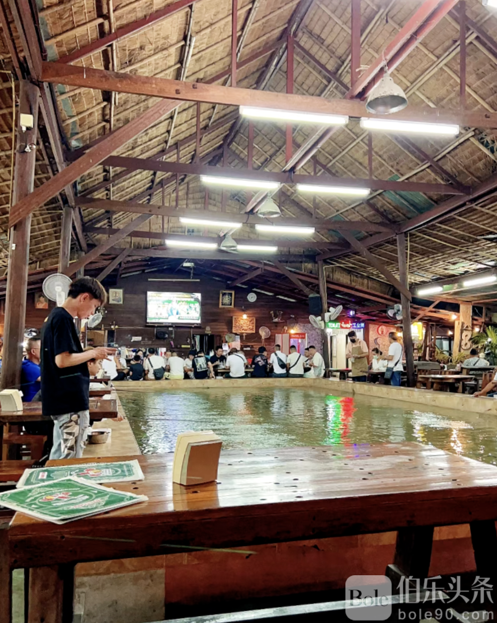 8巷餐厅的环境没有过多装饰,大排档风格,中间一个大水池,四周摆放着很多木质桌椅,没有空调,但是随处都安装了风扇也很凉快。就餐区的正中间上方挂着一个大电视,一直播放着泰国热门影视剧(若有球赛就放球赛),所以在这里你能看到很多一边钓虾一边抬头看电视的食客,可谓是悠闲至极!