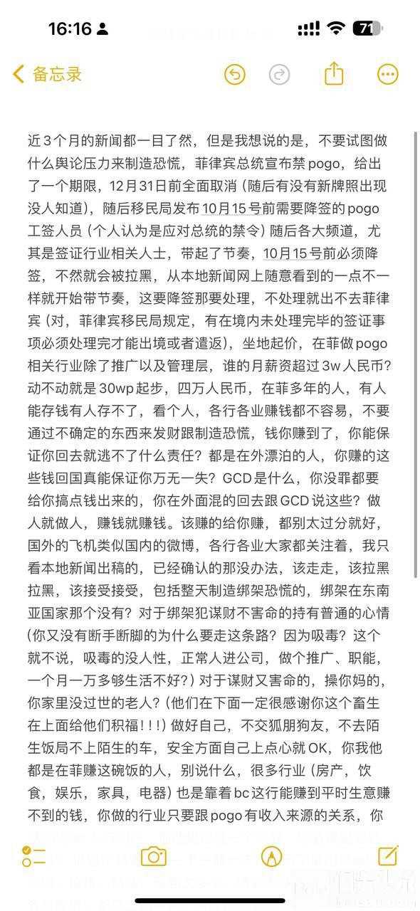 本地新闻网上随意看到的一点不一样就开始带节奏,这要降签那要处理,不处理就出不去菲律宾(对,菲律宾移民局规定,有在境内未处理完毕的签证事项必须处理完才能出境或者遣返),坐地起价,在菲做pogo相关行业除了推广以及管理层,谁的月薪资超过3w人民币?动不动就是30wp起步,四万人民币,在菲多年的人,有人能存钱有人存不了,看个人,各行各业赚钱都不容易,不要通过不确定的东西来发财跟制造恐慌,钱你赚到了,你能保证你回去就逃不了什么责任?