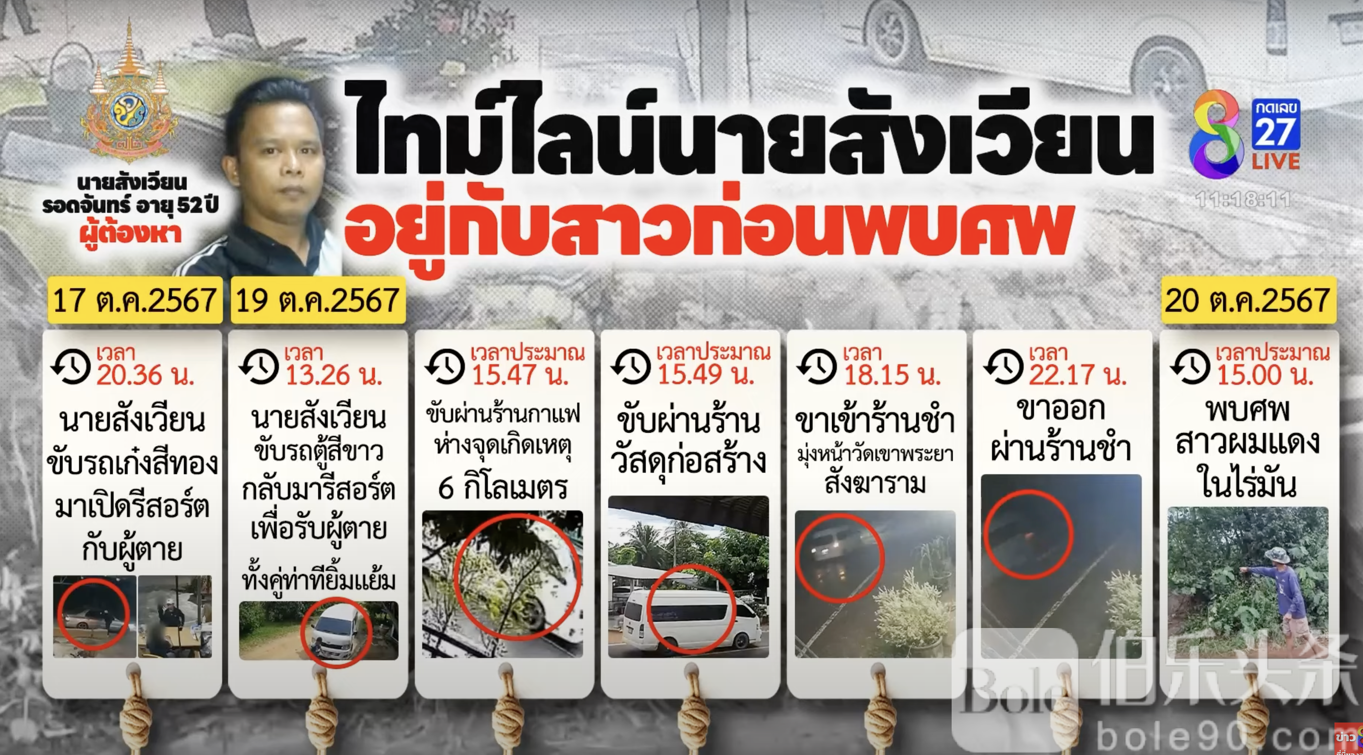 10月19日,嫌疑人再次驾驶厢型车进入度假村,最后一次与死者同车离开。当天晚上21:00,警方在曼谷成功将52岁的嫌疑人逮捕。