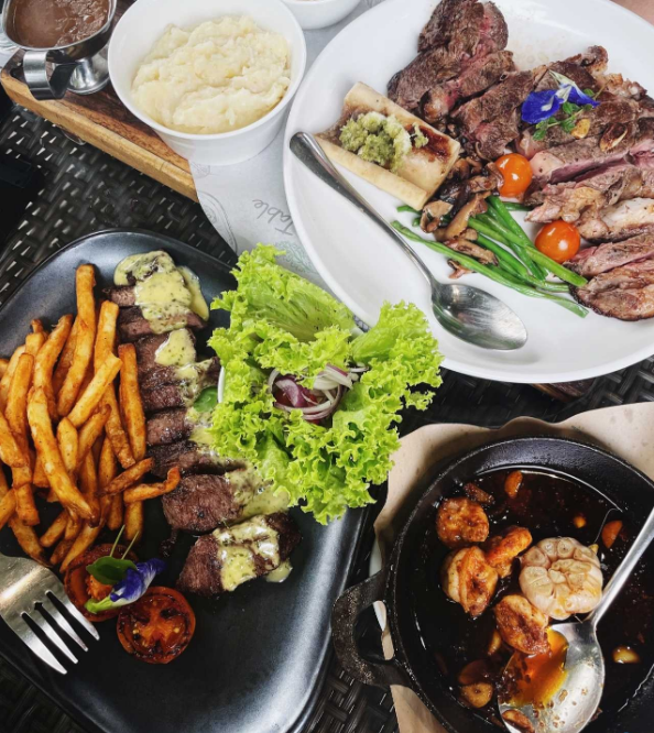 牛排、沙拉、烤猪排骨、披萨、意面都挺好吃