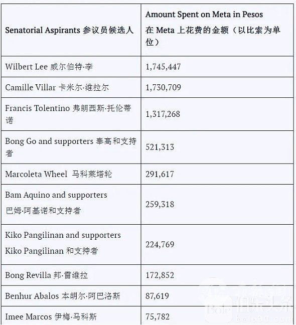 我们可以有一个大概印象——一位参议员候选人为了参选造势,两个月的广告投放费就超过174万比索!