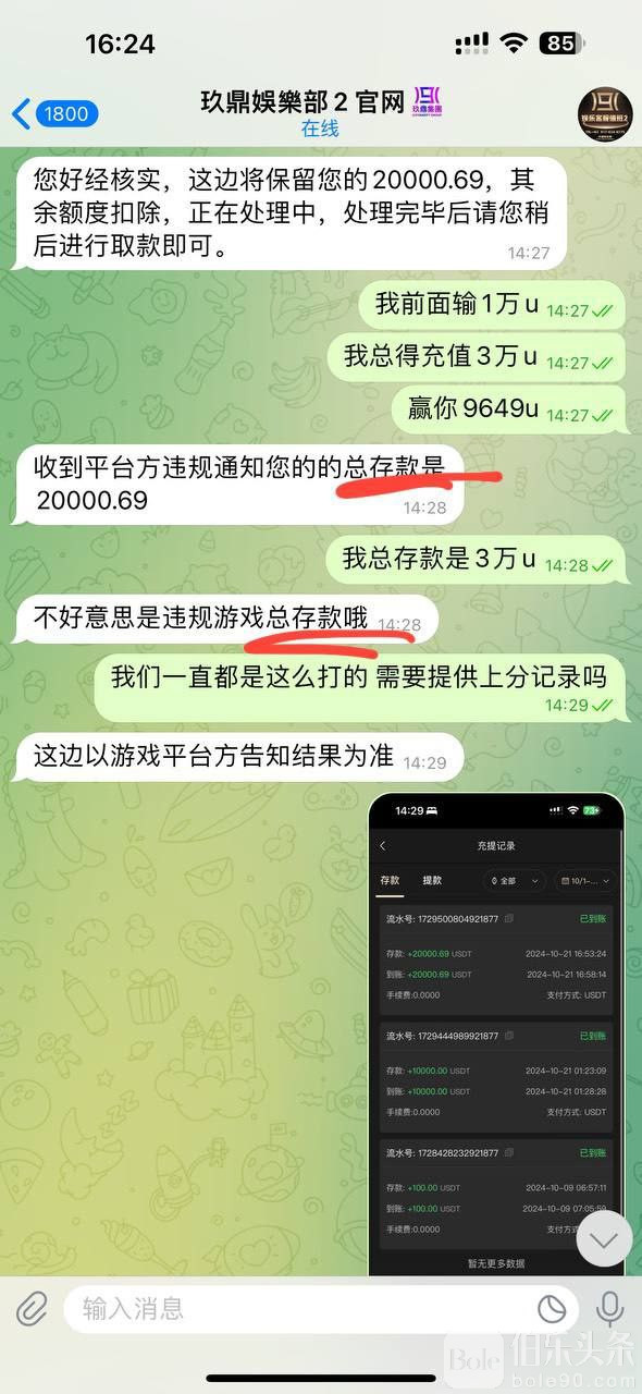 菲律宾玖鼎输不起,当天日期10-21日输1万美金后又充值2万美金,后2天,总盈利9649美金,金额39649美金,直接说非法投注 也不给证据 吃本金1万美金,FB盈利9649美金扣除,一言堂,跟他协商的余地都没有,本金也不退,嘴上一直说自己是信誉平台,实际什么都他们自己说了算,想黑就黑,想跑就跑,血汗钱都被这狗牌子吃了 大家注意 黑平台不要去玩代理网址9d988.com