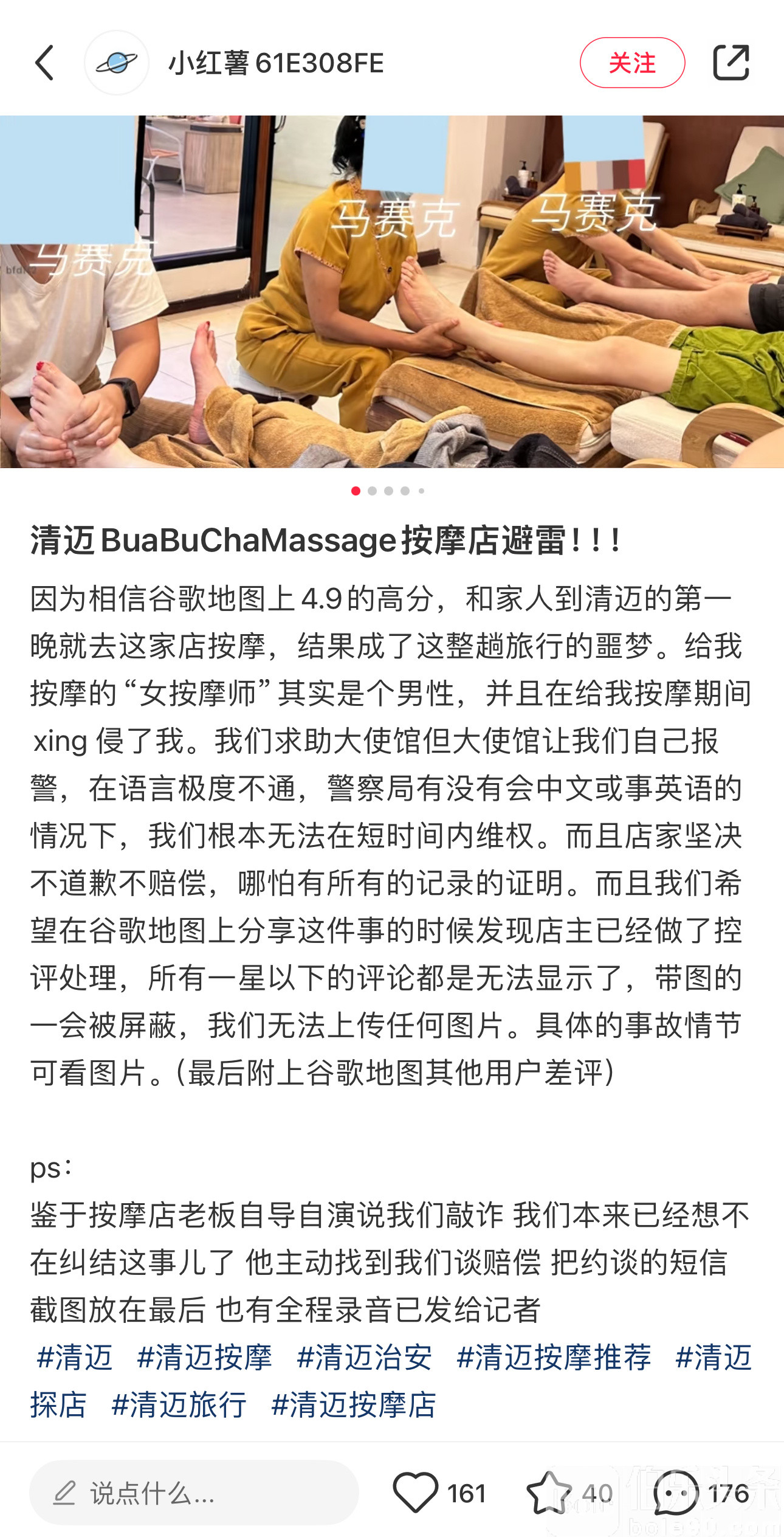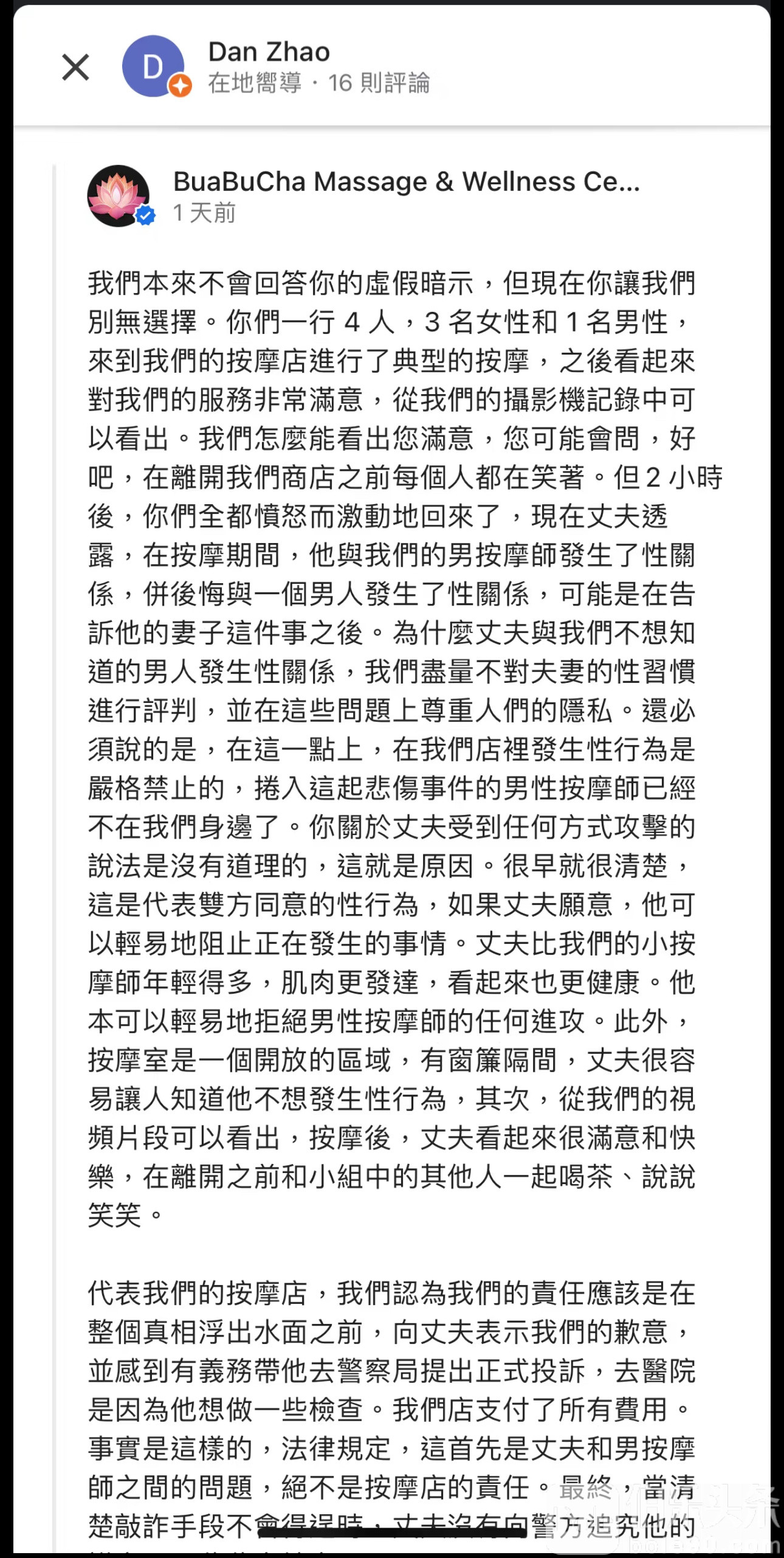 随后,这位游客将自己的经历发布在Facebook上,导致事件迅速发酵。按摩店方面则表示,游客的帖子严重歪曲事实,损害了店铺声誉。店主和按摩师已向警方报案,控告该游客及帖子的发布者诽谤。