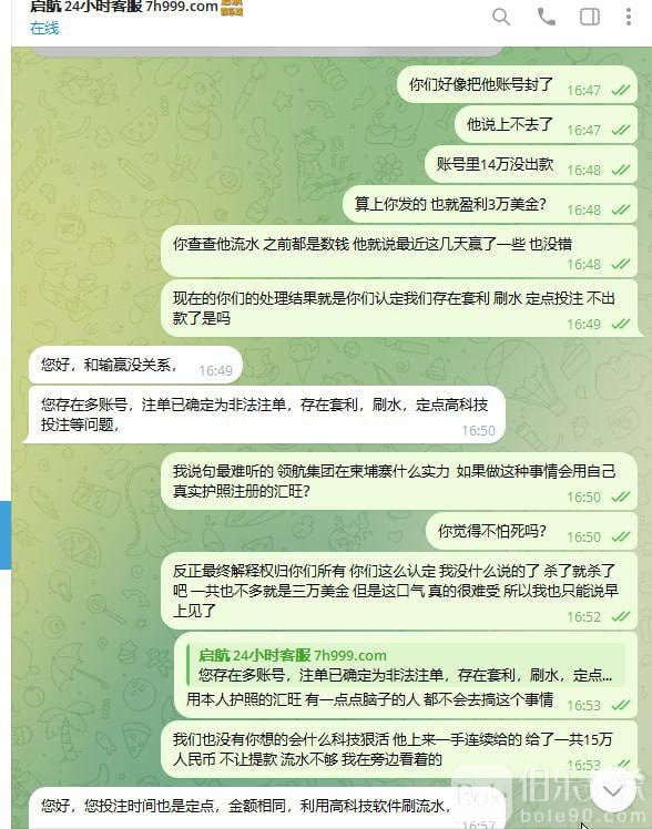 但是一直到晚上12点起床,加了客服的飞机,聊天的结果就如下图了。我不清楚到底是哪里的问题,客服解释的很冠冕堂皇因为我跟我哥哥2个人lp一样所以导致不出款,我想请问一下我们都在一个办公室使用同一个无线不是在正常不过的事吗?并且我们玩的是电子并非其他的,希望启航的高层看到了关注一下这个问题,这次我不会说的太难听,但是如果一直不处理的话,这种跟我讲7个工作日的话,就不要再说了。