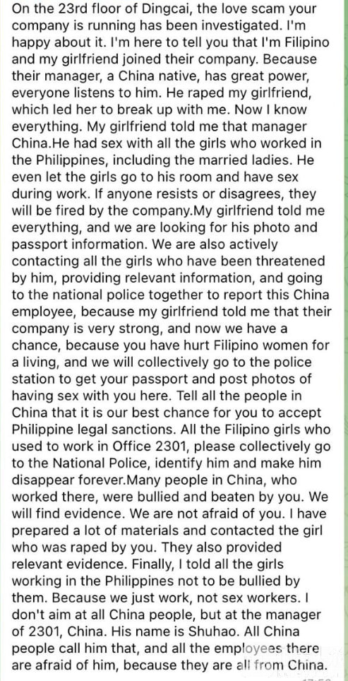 中国有很多人,在那里工作过,被你们欺负过,殴打过,我们会找到证据的,我们不怕你们,我准备了很多材料,联系了被你们强奸的女孩子,她们也提供了相关证据。最后我告诉所有在菲律宾工作的女孩子,不要被他们欺负。因为我们只是工作,不是性工作者。我并不是针对所有中国人,而是针对中国2301的经理,他叫书豪,所有中国人都这么叫他,那里的员工都怕他,因为他们都是中国人。