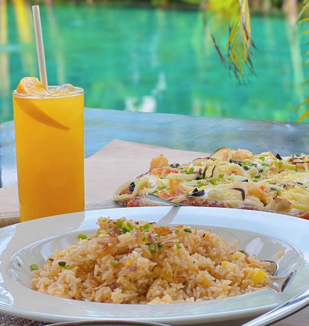 吃的话还真的没啥吃的,分两个餐厅全素食餐厅|海鲜餐厅,但是我吃不惯。建议还是自备干粮去,带点泡面或者小火锅啥的…哈哈哈