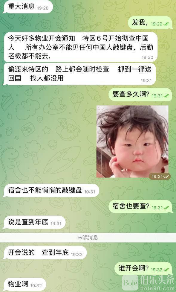 今天好多物业开会通知  特区6号开始彻查中国人 所有办公室不能见任何中国人敲键盘