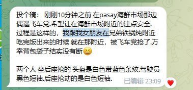 网友投稿: 刚刚10分钟之前 在pasay海鲜市场那边偶遇飞车党.希望让在海鲜市场附近的注点安全。