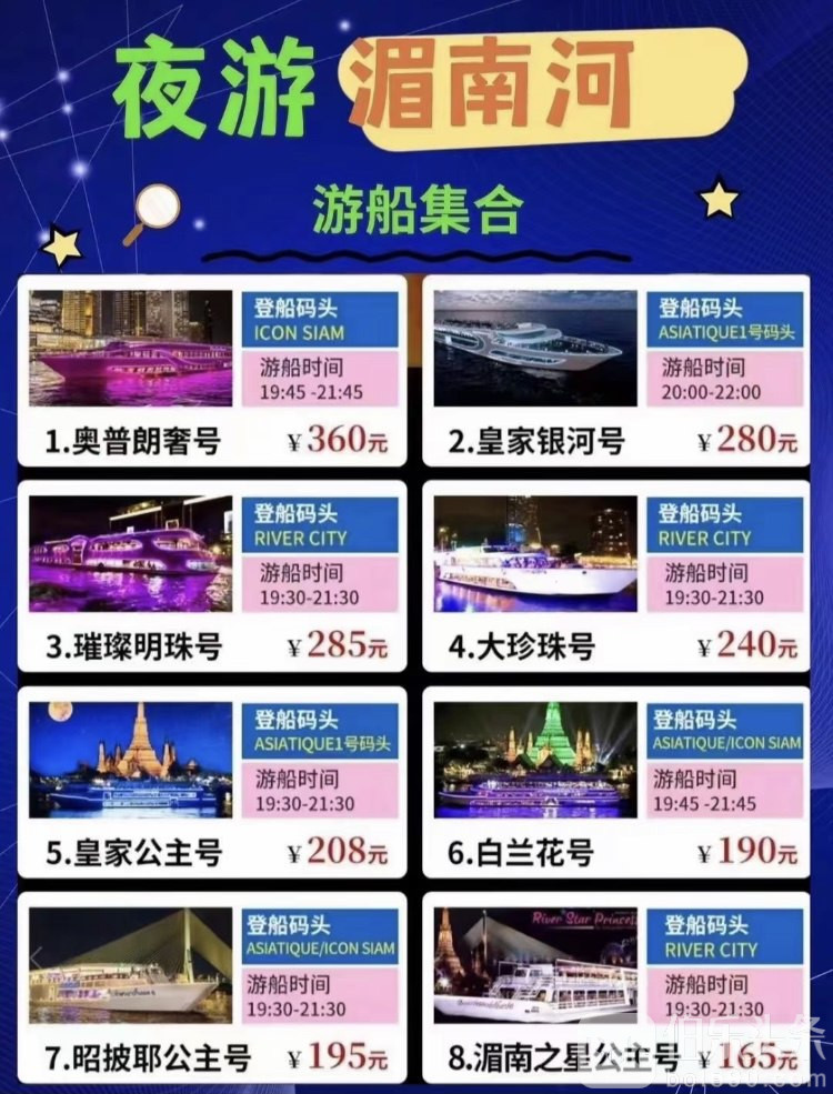 曼谷来都来了肯定要坐一次湄南河游船,来回时间两小时带自助餐。可以看到夜景下的大皇宫/郑王庙/拉马八世大桥/码头夜市等景点。以上为夜游湄南河选船攻略价格以及亮点介绍