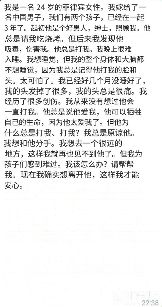 I am a 24 year old Filipino female. I am married to a Chinese man and we have two kids for 3 years. At first he was a good man, a gentleman and took care of me. He always treated me to BBQ. But then I found out that he was taking drugs and he hurt me. He always beat me. It is hard for me to sleep at night. I want to sleep but my whole body and brain don't want to sleep because I always remember the slaps he gave me on my face and head. It is horrible. I haven't slept well for months, my hair has fallen out a lot and my head always hurts. I have been through a lot of trauma. I never thought that he would always beat me. He always said that he loved me and that he could sacrifice his life because he loved me so much. But why did he always slap and beat me? I always forgave him. I want to break up with him. I want to go to a far place so that I can never see him again. But I feel sad for the kids. What should I do? Please help me. Now I do want to leave him so that I can have peace of mind.