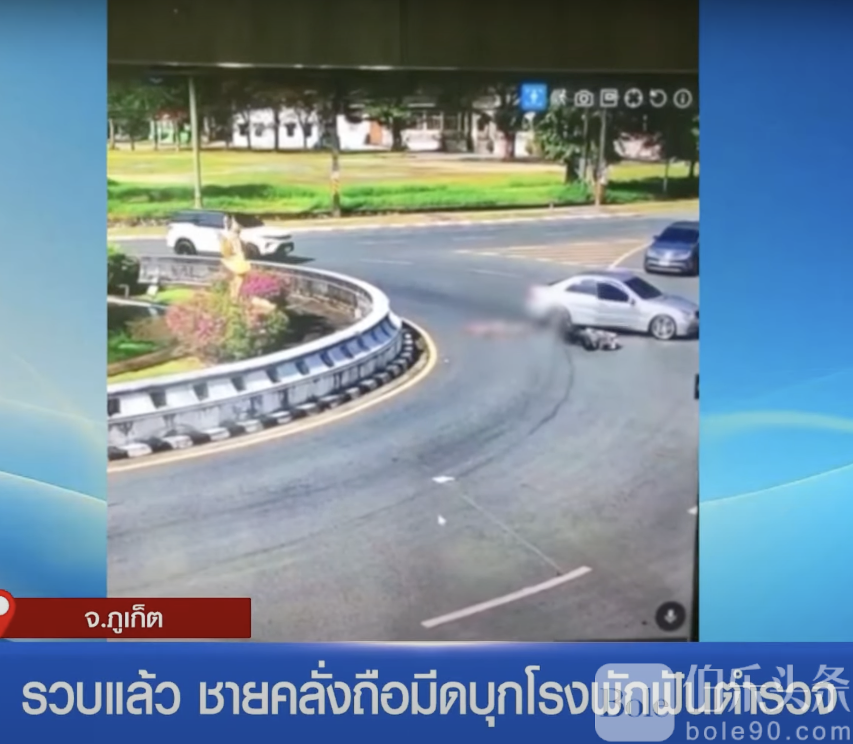 这是一段48岁的舒艾布先生,骑摩托车撞上攀牙府塔普环岛的录像。此前,他持刀闯入普吉府塔查查柴警局,踢开调查员阿卡拉蓬警官的办公室门。阿卡拉蓬警官试图制止他,但被他用刀砍伤左眉上方和左臂,共缝了8针。事件发生在11月17日凌晨近3点。