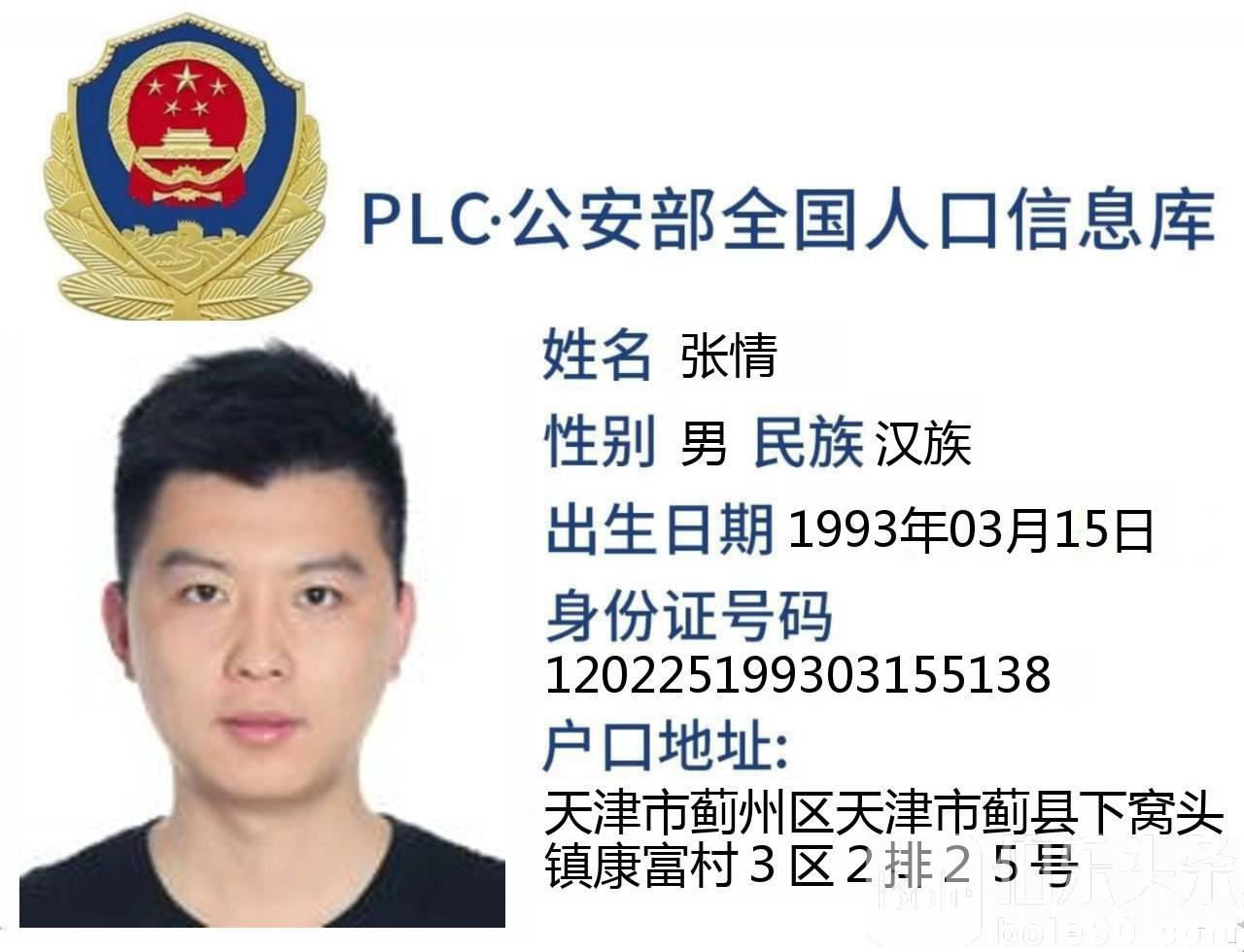 姓名:张情  外号:昂平大队长  身份证号:120225199303155138