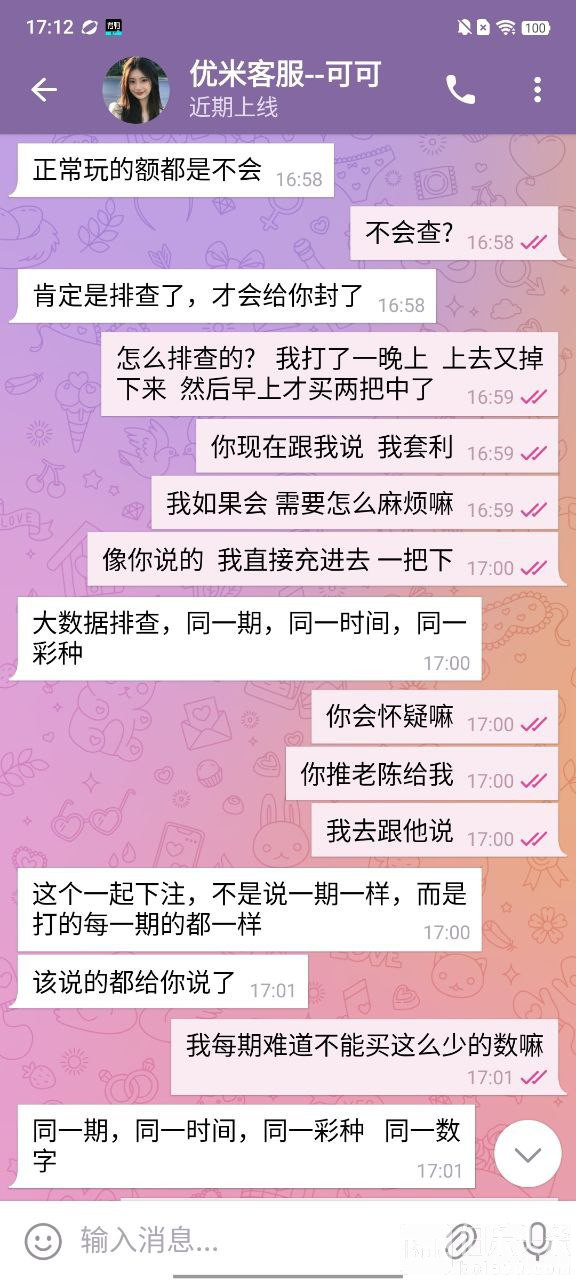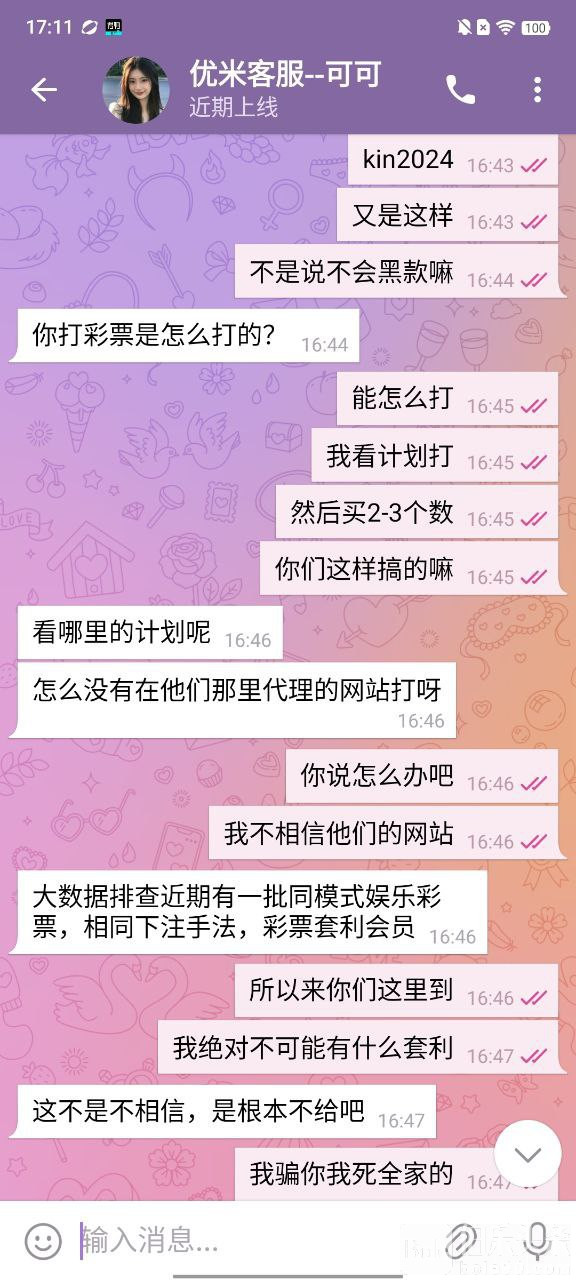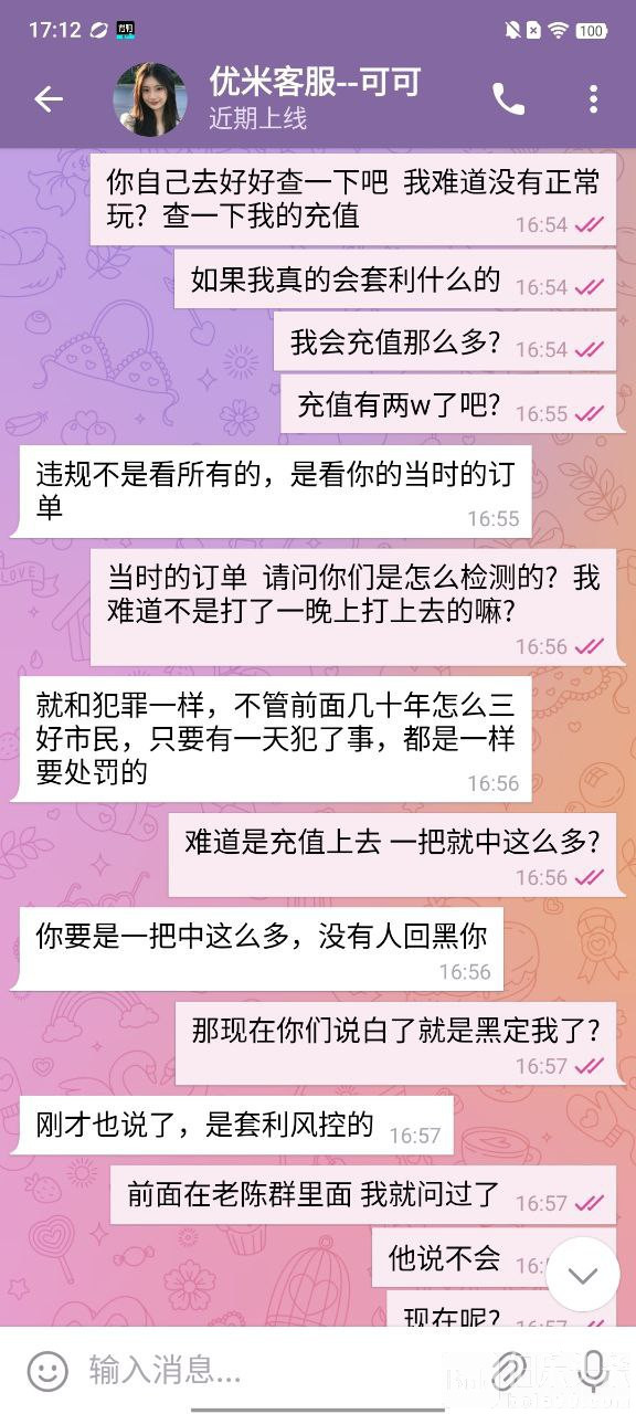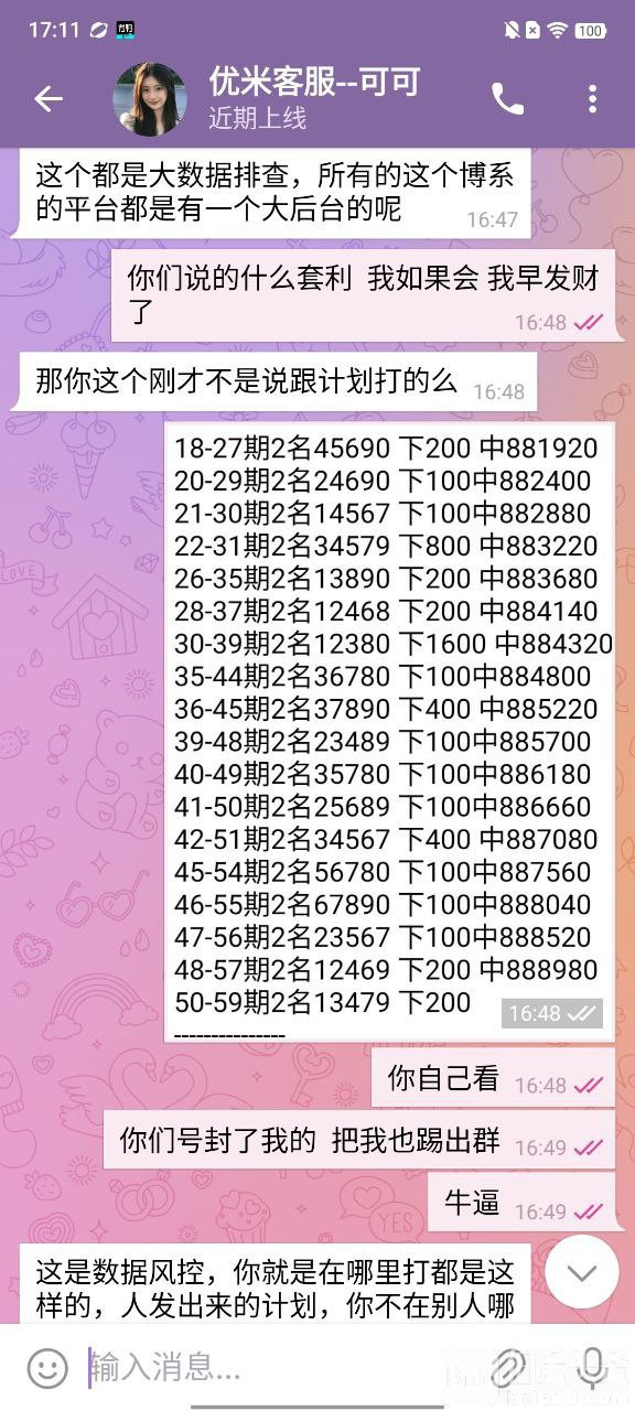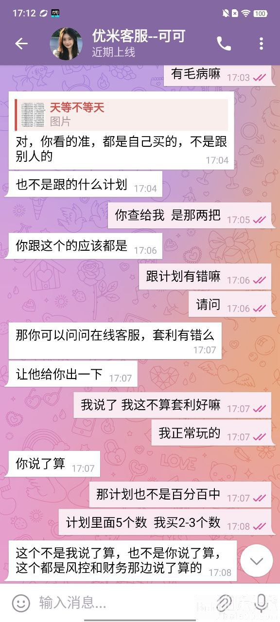 曝光:赢了两w都不给提 说我涉嫌套利 我正常玩 这客服也是搞笑 计划都不让跟😂 谁规定不能看计划 买的准也有错了 前前后后充了两w 提两w都不给提 真的是牛逼 这个傻逼优米体育 还有那个MT老陈 黑了我的钱直接把我踢出群 祝你死全家