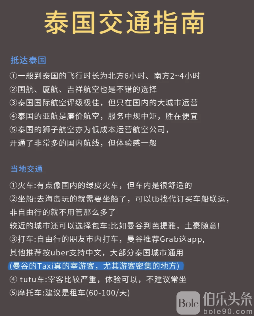 🚗泰国交通:1️⃣火车:有点像国内的绿皮火车,但车内是很舒适的2️⃣坐船:去海岛玩的就需要坐船了,可以tb找代订买车船联运,非自由行的就不用管那么多了较近的城市还可以选择包车:比如曼谷到芭提雅,土豪随意!3️⃣打车:自由行的朋友市内打车,曼谷推荐Grab这app,其他推荐按uber支持中文,大部分泰国城市通用(曼谷的Taxi真的宰游客,尤其游客密集的地方)4️⃣tutu车:宰客比较严重,体验可以,不建议常坐5️⃣摩托车:建议是租车(60-100/天)