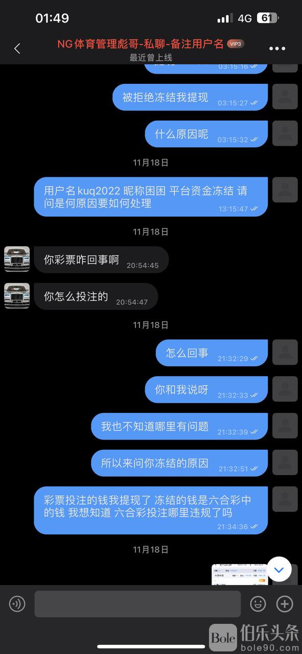 18号凌晨3:00询问冻结原因要如何处理 18号晚上9:00他来一句我的彩票投注怎么回事 我当时就很纳闷 彩票我都提现 彩票有啥问题 回复慢的很 19号我说出三点问题 所谓的管理来一句官方反馈非法手段 要我自己讲做了啥 表达的那么清楚你还问我啥 接下来的今天就和个机器人一样重复得让我说我怎么用的非法手段 还说要和我合作 直到21号拿不出证据来就说不和我聊 我就该慌