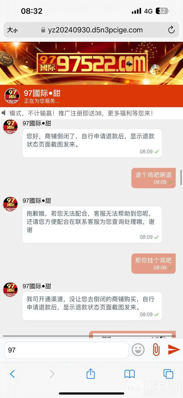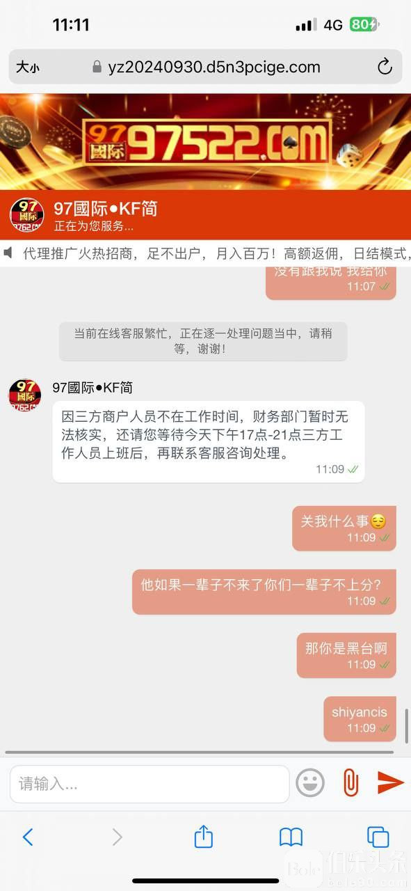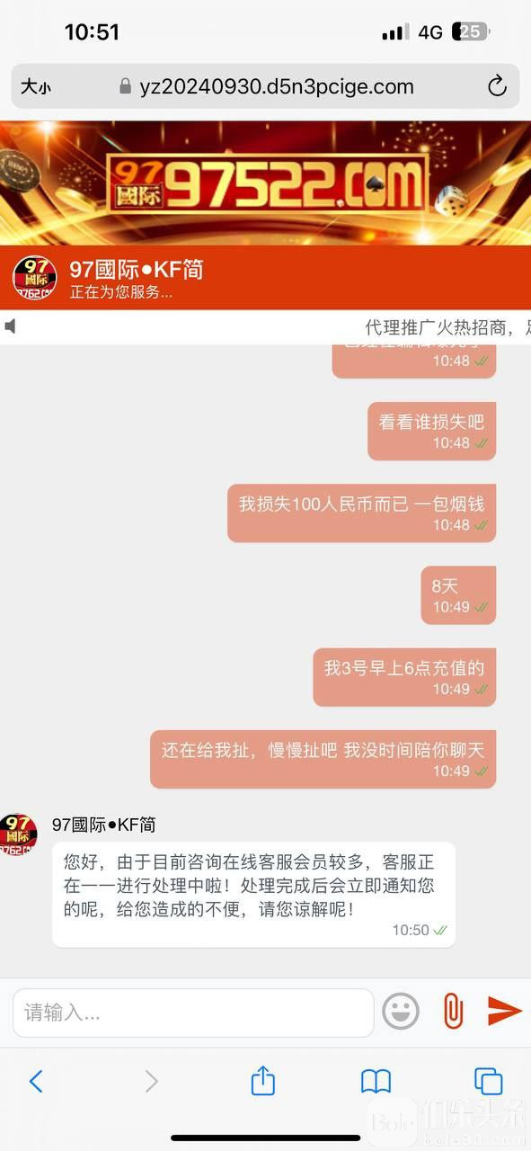 100人民币都处理不清楚,3号早上6点充值的,要我提供所有凭证都提供了,今天问客服还让我继续等,本来没多少钱都懒得曝光。我只是让大家避坑,97国际是真的活不起了,100rmb都黑。我把要投稿的截图发给他们马上给我到账,可是我很想知道为什么上分要200多个小时到账。他们解释不出来。听说97国际总部在缅甸,今年行情是不好,该不会要割韭菜了吧。