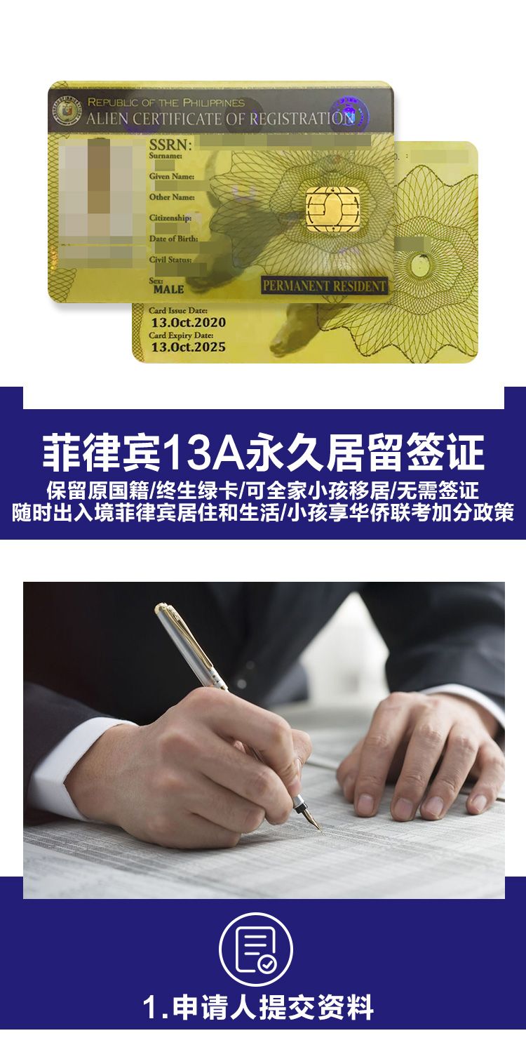 菲律宾13a属于永居类签证,可以是和菲律宾人结婚后办理的永居签证。也可以是已经入籍菲律宾的华人后代生的孩子领取原国籍护照后办理的永居签证,比如你的父母之一原本是中国籍,持有中国护照,后面生的孩子也持有中国籍,那么这个中国籍想办理一个在菲律宾合法的签证那么就可以办理 MCL 07 21特赦签证。或者其他国籍的人和菲律宾人结婚后,生的孩子持有菲律宾以外的国籍然后用这个国籍申请的永居签证。签证全名叫:MCL-07-21