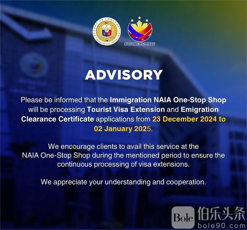 请注意,尼诺-马尼拉国际机场移民局一站式服务中心将于2024年12月