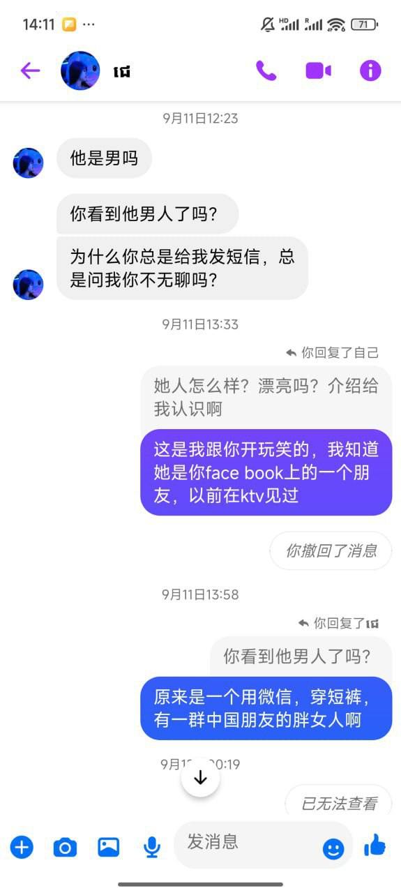 我是5月知道你的,当时我和阿美还没分手。4月我被你绿了,但我不怪你,我知道她肯定没跟你说实话。8月我又把你给绿了,当时她撒谎说你回国后就分手了,于是又来跟我睡。后来我发现不对劲,就又跟她分手了。但我们一直在联系,11月我才知道,你至少9月就回来了(视频2)。但她甚至不承认你是男人,所以我为了讽刺她,一直叫你绿裤子胖女人(图6)。